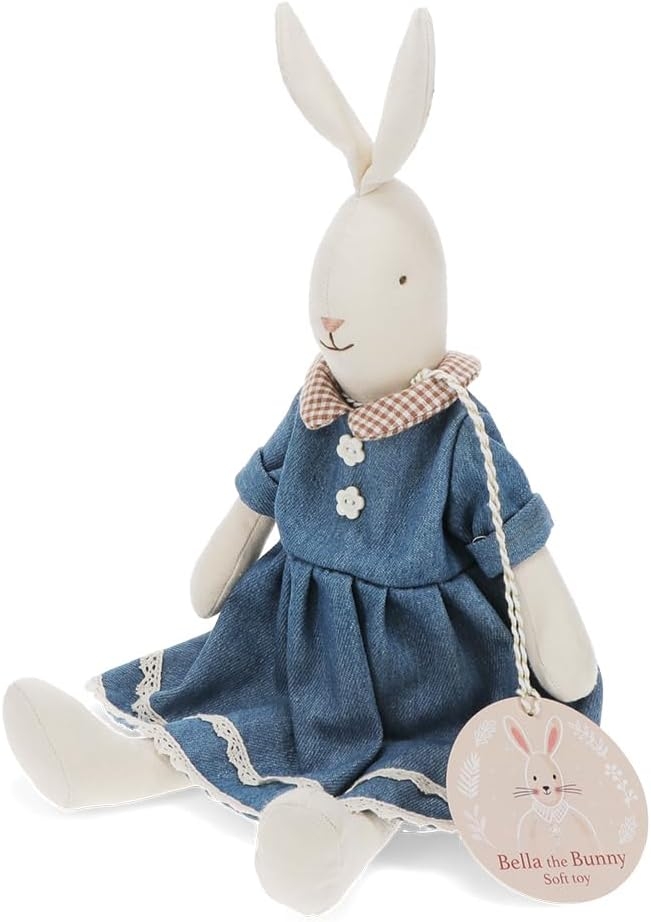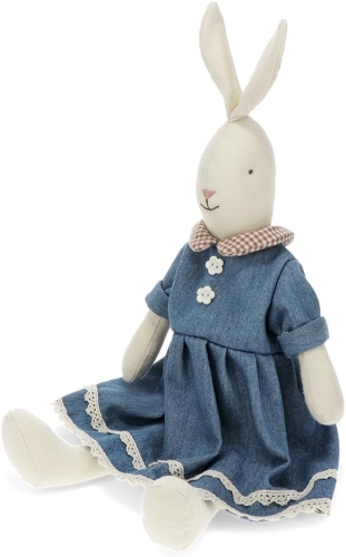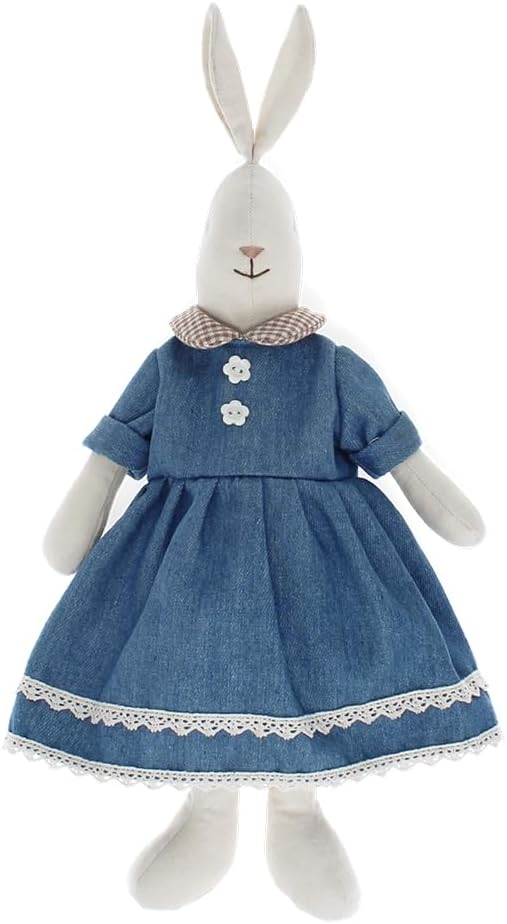This adorable bunny is wearing a smart blue dress with gingham collar