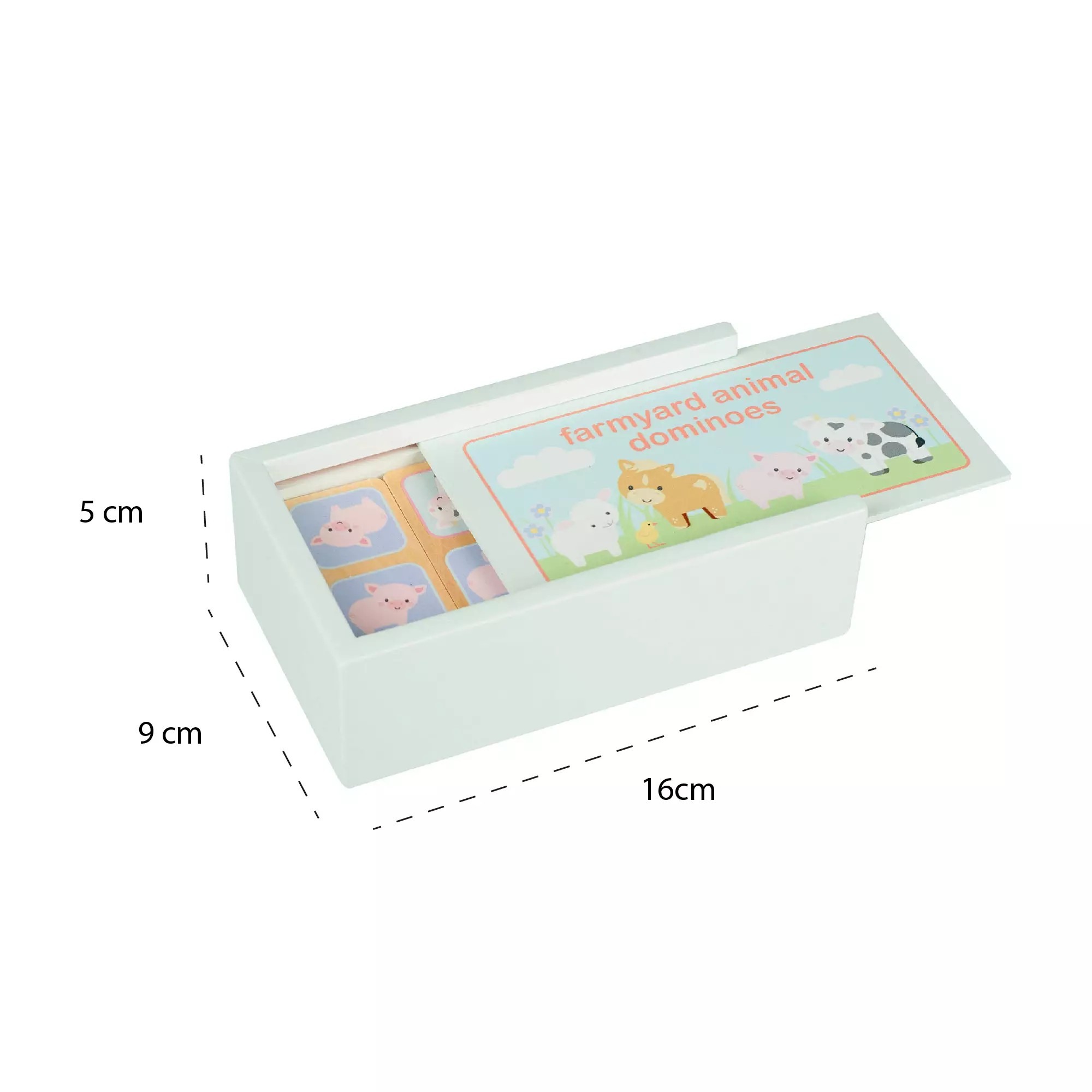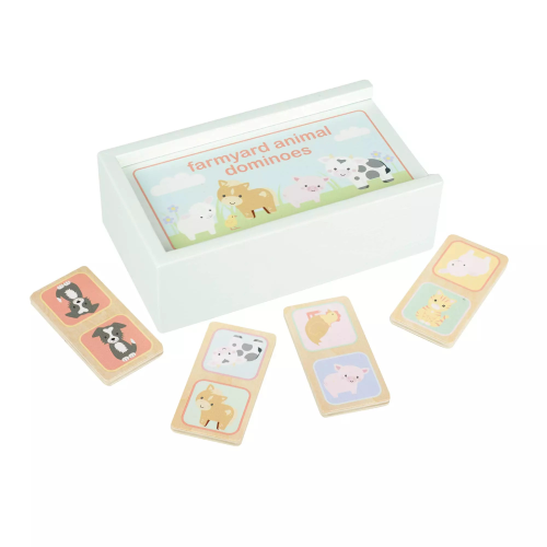 A beautiful set of 28 wooden dominoes, each with a different combination of a farmyard animals on colourful backgrounds.