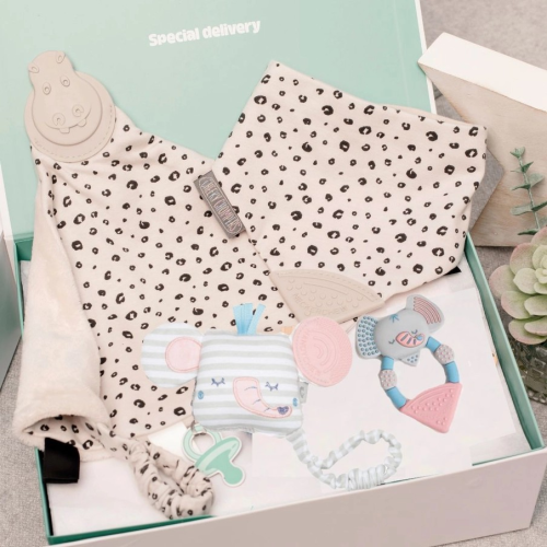A beautiful, practical and stylish new baby gift set that is suitable for a baby shower, a new arrival or a teething tot!