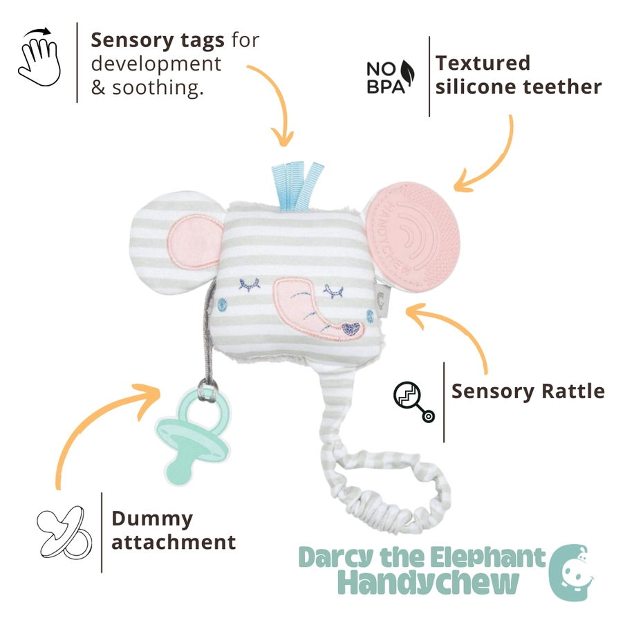 • A Darcy the Elephant Handychew - a compact teething toy bursting with sensory features that lets little ones chew and play.