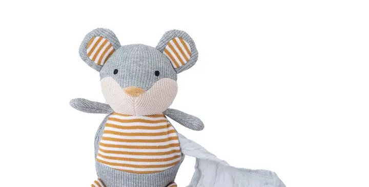 Made from from soft, durable grey and white knitted fabric and dressed in a smart mustard striped top, this sweet mouse is designed to comfort and engage your little one.