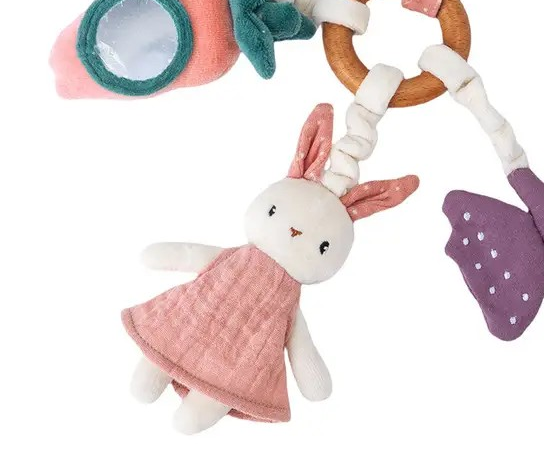 This charming activity ring includes a soft organic cotton velour white rabbit, a crinkly butterfly, and a strawberry with a shiny mirror detail – a perfect combination of fun and developmental play.