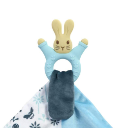 The comforter features a detachable, 100% silicone rabbit-shaped teether with soft and safe teething bumps.
